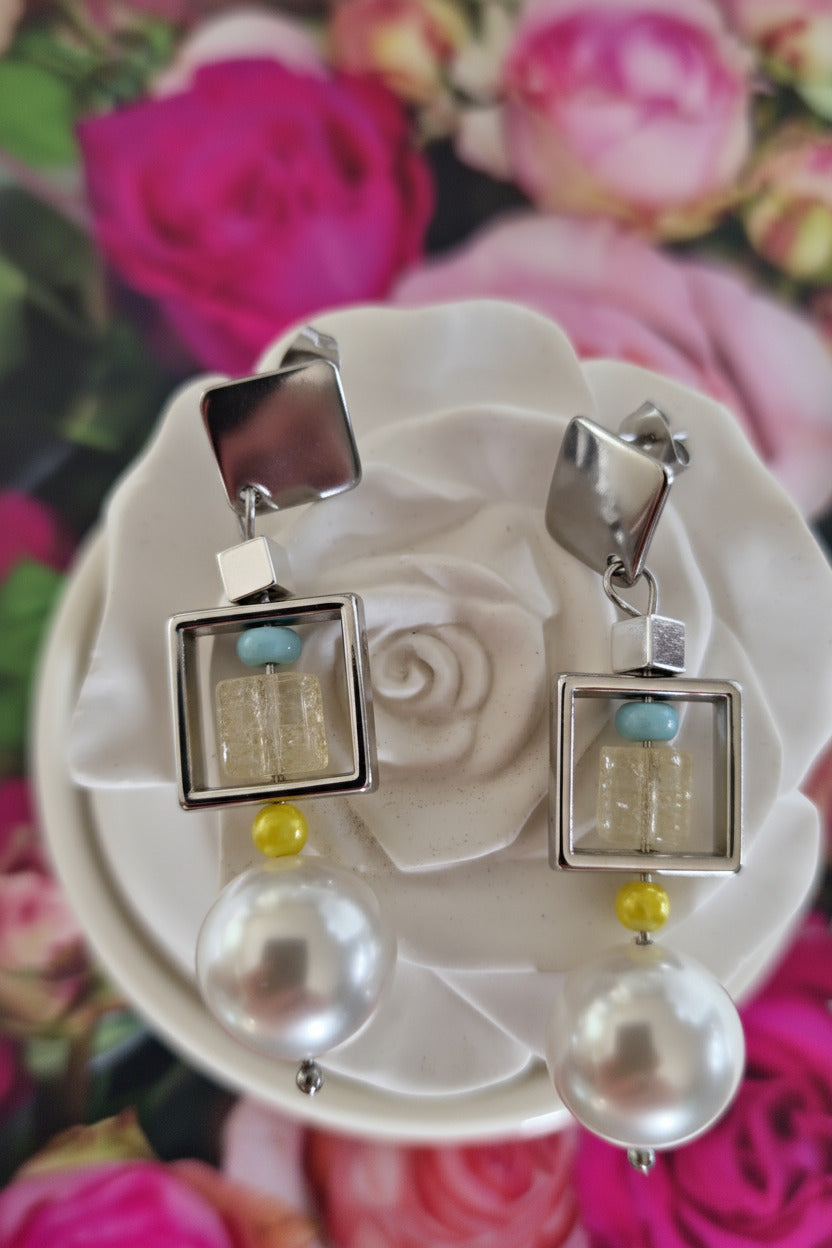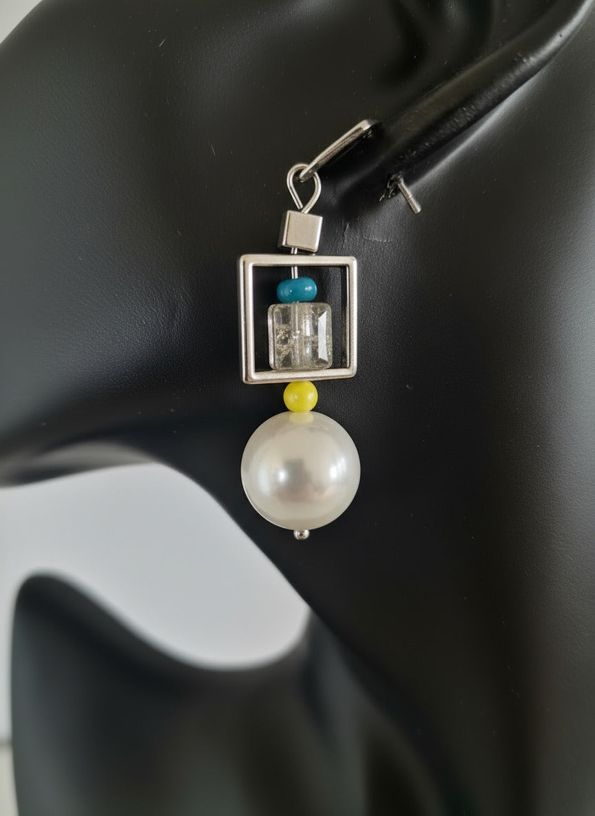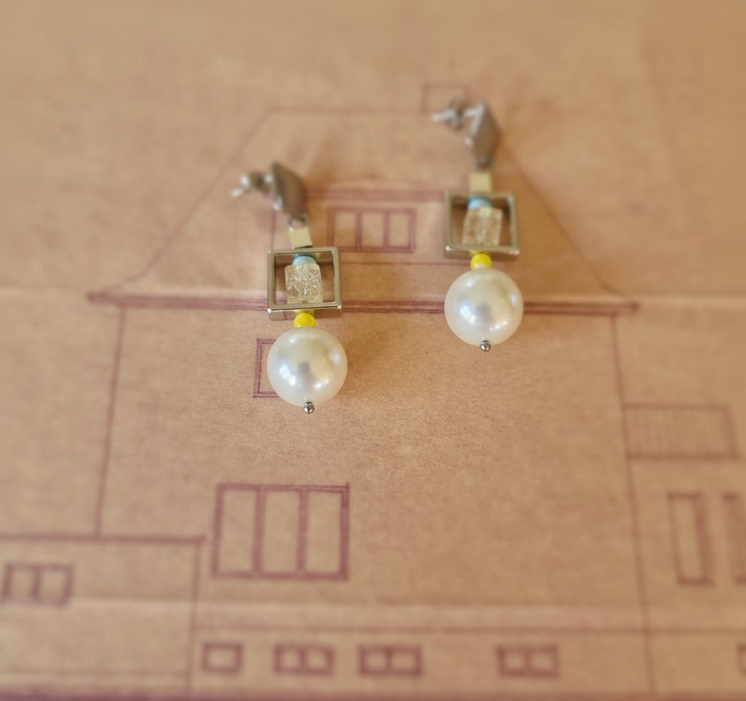 Diese Ohrstecker „Kubica Dünnes Eis“ vereint eine elegante 14 mm große weiße Muschelkernperlen mit einem zartgelb schimmernden, transparenten Glaswürfel im Edelstahlrahmen. Ergänzt werden sie durch zwei kleine gelbe und blaue Glasperlen sowie einen versilberten Hämatitwürfel. Gefertigt aus hochwertigem Edelstahl in Rhombus-Form bieten sie langlebigen Tragekomfort und stilvolle Akzente für anspruchsvolle Schmuckliebhaber.